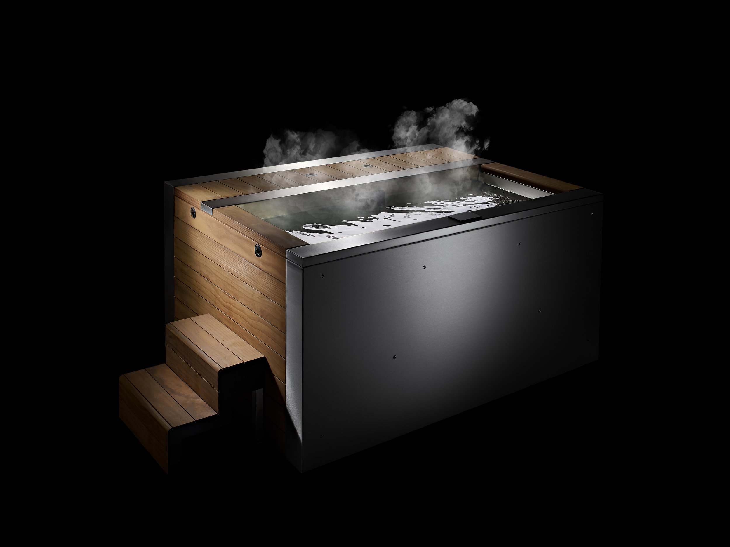 Designed to fit perfectly next to the Tubmarine hot tub or ice bath, the robust Kebony steps feature black powder-coated side panels and brushed stainless steel legs.
